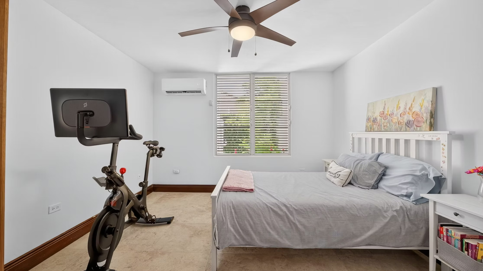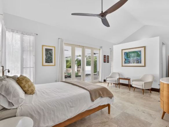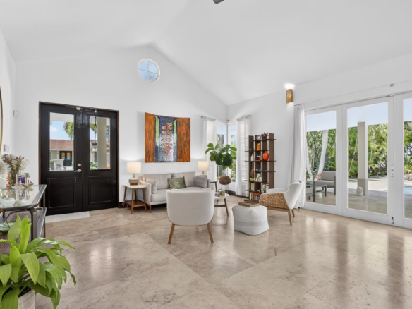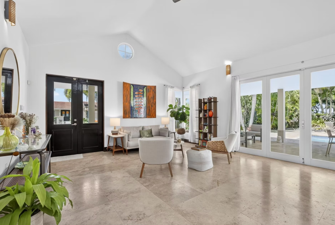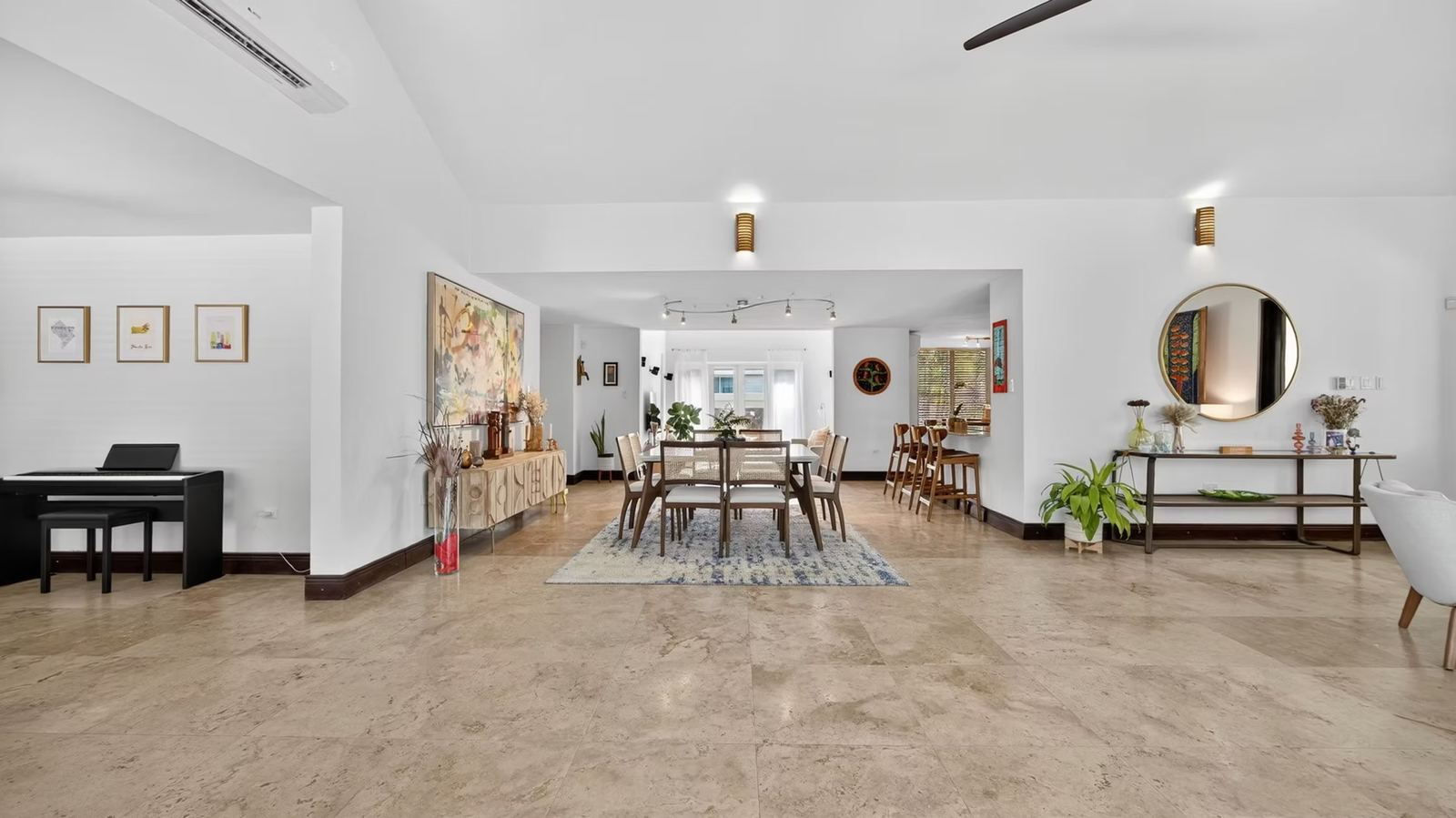 The home features a spacious living room, dining area, family room, a dedicated office, and a modern kitchen with S/S GE appliances, ample storage, and a secondary prep nook. Travertine marble flooring extends throughout the interior, terraces, and driveway. Climate control includes seven split A/C units and Big Ass Fans.